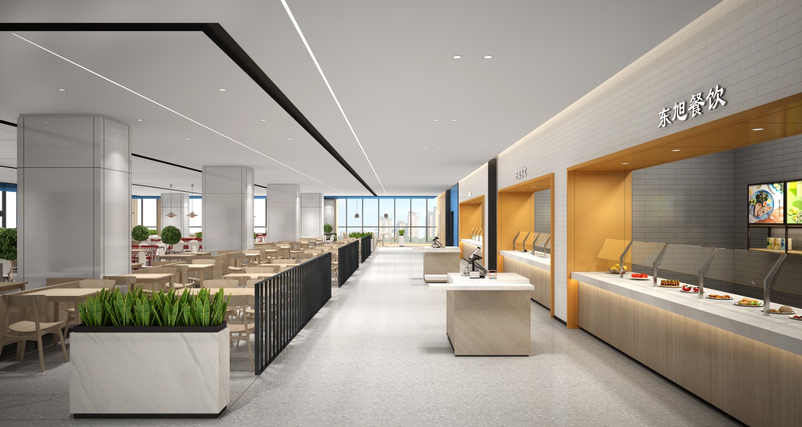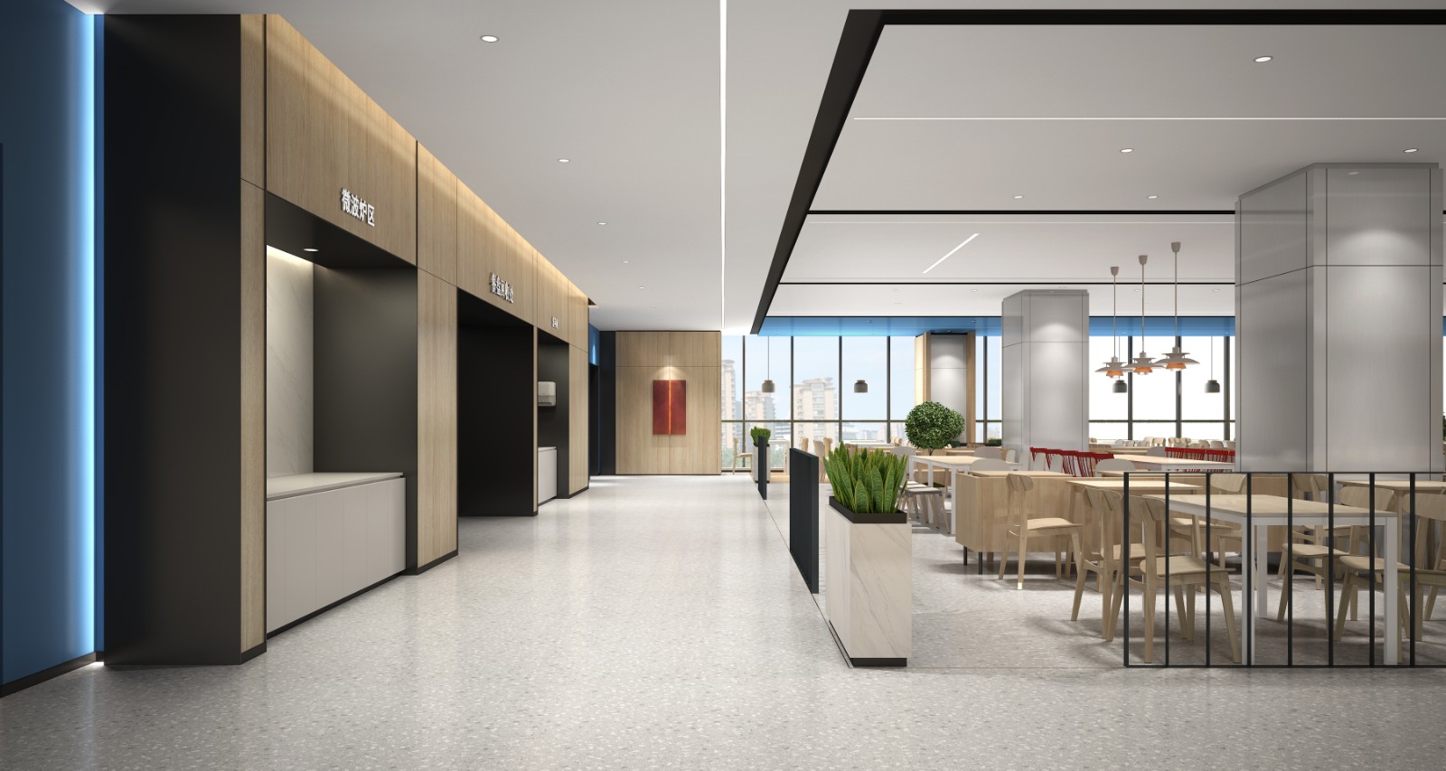 如果說臨窗的就餐區(qū)是月泉浪漫的星夜,橙色的檔口區(qū)模擬溫暖的夕陽,那么中間的餐區(qū)就是代表科技的沙漠綠洲。金屬材質(zhì)現(xiàn)代科技感十足,木質(zhì)桌椅溫潤自然,大盆綠植規(guī)律擺放,搭配錯(cuò)落有致。中間的紅色座椅區(qū)仿佛熱烈燃燒的火焰,代表強(qiáng)烈的生命力與創(chuàng)造力。銀色的立柱磅礴大氣,整個(gè)空間自由開闊,彰顯著企業(yè)不凡的品味與格局。微波爐區(qū)與餐盤回收傳送帶的設(shè)置十分人性化,在力求簡約舒適之余,為企業(yè)提供精致但實(shí)用的員工餐廳設(shè)計(jì)。